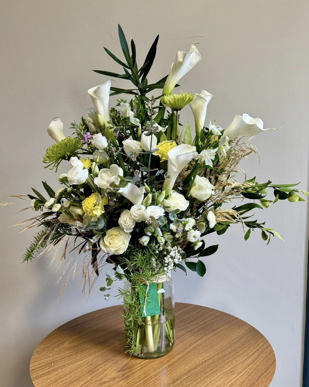Você está prestes a conhecer um arranjo floral em pote de vidro que é como um abraço florido: 30 hastes nobres de flores e folhagens que brigam para serem notadas!