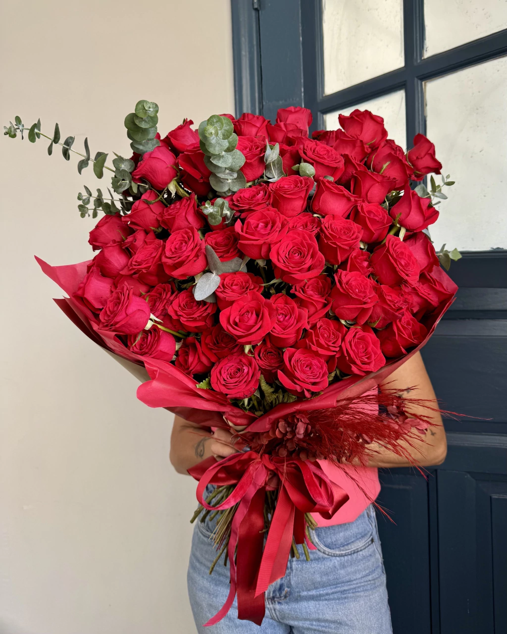 Uma explosão de amor em 100 rosas vermelhas com folhagens fresquinhas! Este mega buquê é impossível de passar despercebido, com um toque exclusivo e moderno.