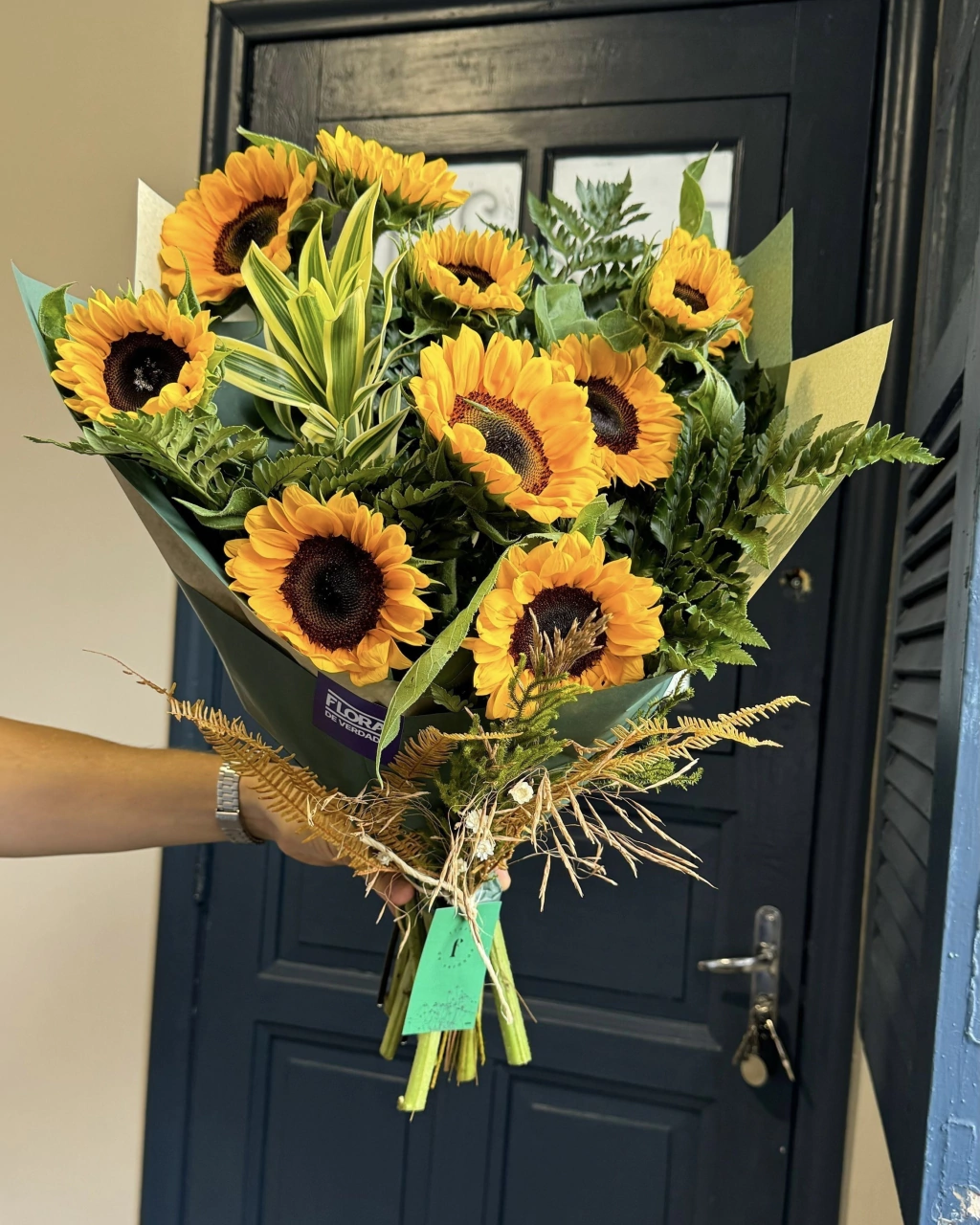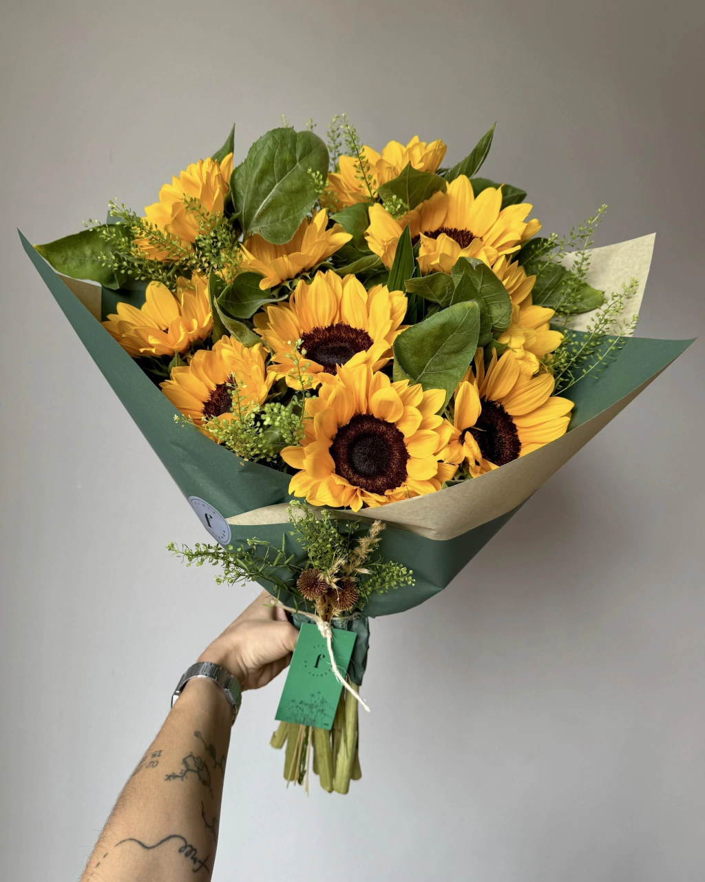 Buquê composto por 10 Girassóis e folhagens frescas. Nossa embalagem orgânica completa o design floral moderno e sofisticado desse clássico. Um presente vibrante para alegrar, traduzir carinho e homenagear a resiliência.