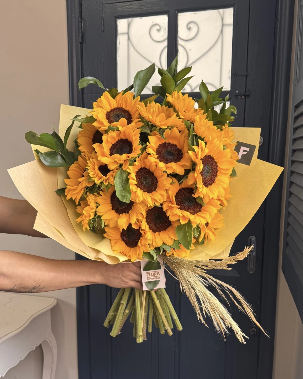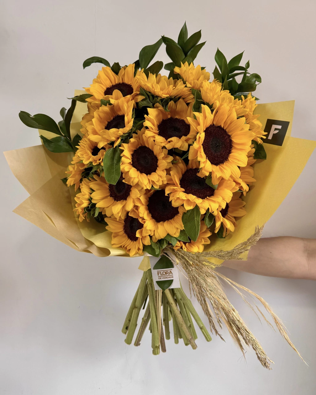 Buquê composto por 20 Girassóis e folhagens frescas. Nossa embalagem orgânica completa o design floral moderno e sofisticado desse clássico. Um presente vibrante para alegrar, traduzir carinho e homenagear a resiliência.