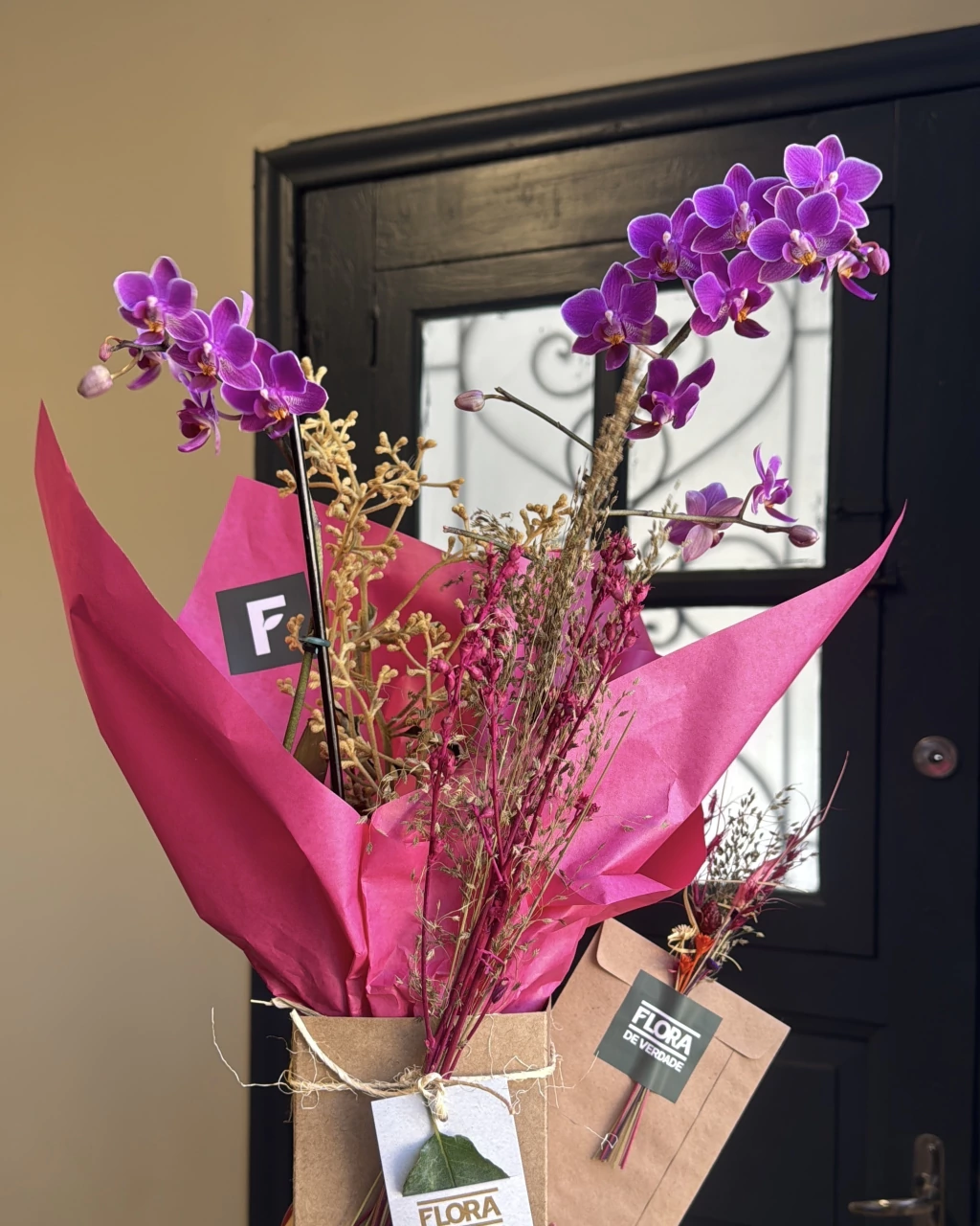 Esta encantadora mini orquídea é ornamentada com flores secas, criando um arranjo único e sofisticado. A beleza das orquídeas é perfeitamente complementada pela embalagem orgânica e elegante, feita em caixa de kraft, que traz um charme especial.